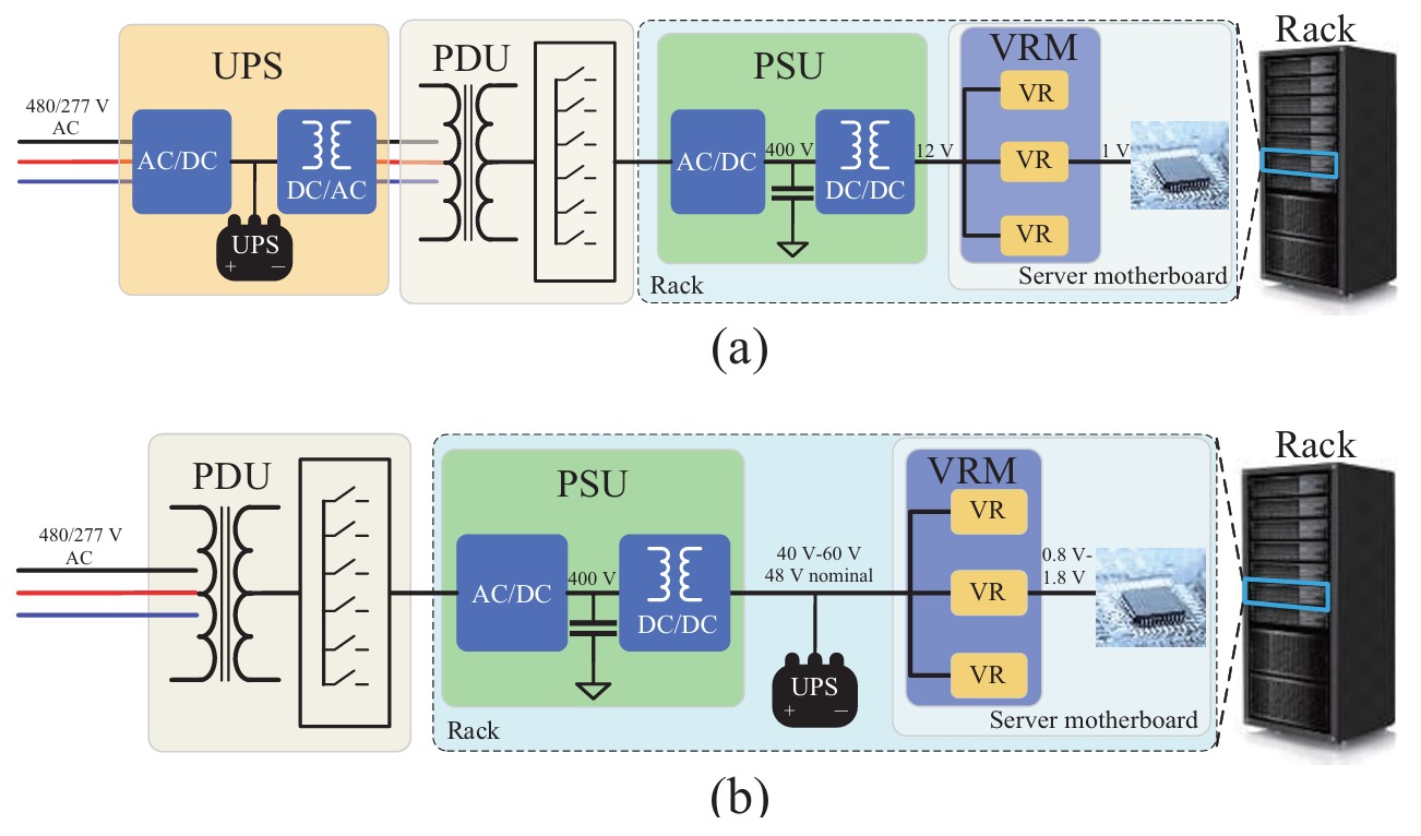 Figure 2 illustrates this topological shift. In the legacy 12-V architecture (Figure 2a), the rack-level bus distributes high current, creating thermal challenges. With the use of the emerging 48-V architecture (Figure 2b), 48 V is distributed directly to the server blades, reducing the copper mass of the bus bars and minimizing distribution losses (I²R).