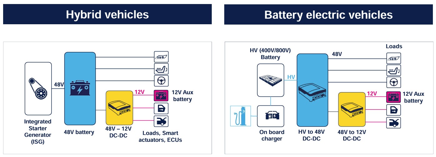 Battery Electric Vehicles: The 48-V rail is derived from the High Voltage (HV) traction battery via an HV-to-48 V dc-dc converter. This separates high-power auxiliary loads from the 12-V network.
