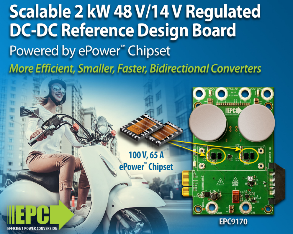 EPC announces the availability of the EPC9170, a 2 kW, two-phase 48 V – 14 V bidirectional converter that operates with 96.8% peak efficiency in a small footprint. The board features the ePower 100 V, 65 A integrated circuit chipset. The chipset includes the EPC23101 eGaN IC plus EPC2302 eGaN FET for a solution capable of a maximum withstand voltage of 100 V, delivering up to 65 A load current, while capable of switching speeds greater than 1 MHz.