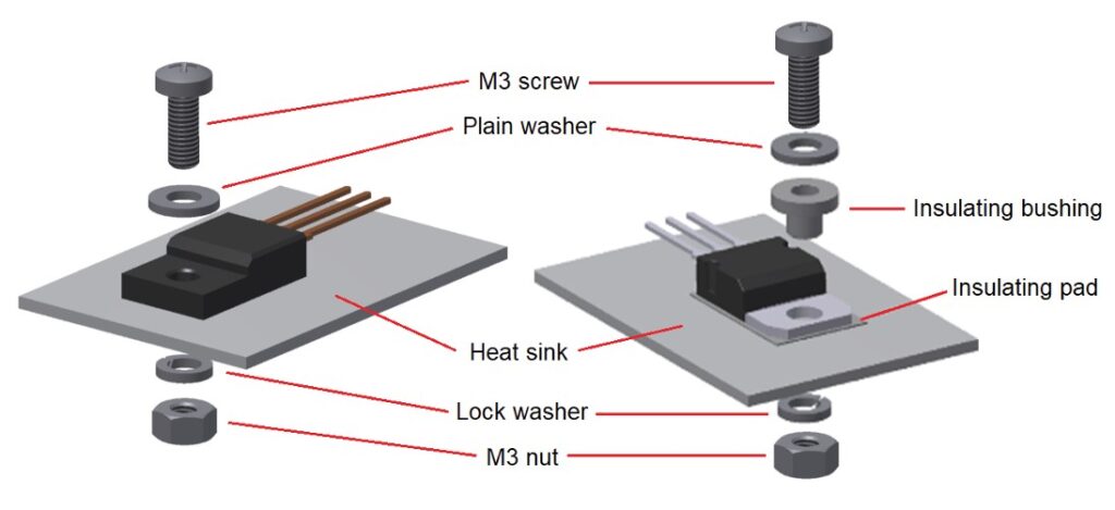 A: Screw mounting is normally used for through-hole device packages such as the TO-220. For stable thermal contact, a plain washer is placed between the screw head and the mounting tab and is often used with a lock washer and nut. The effectiveness of this method depends on torque accuracy.