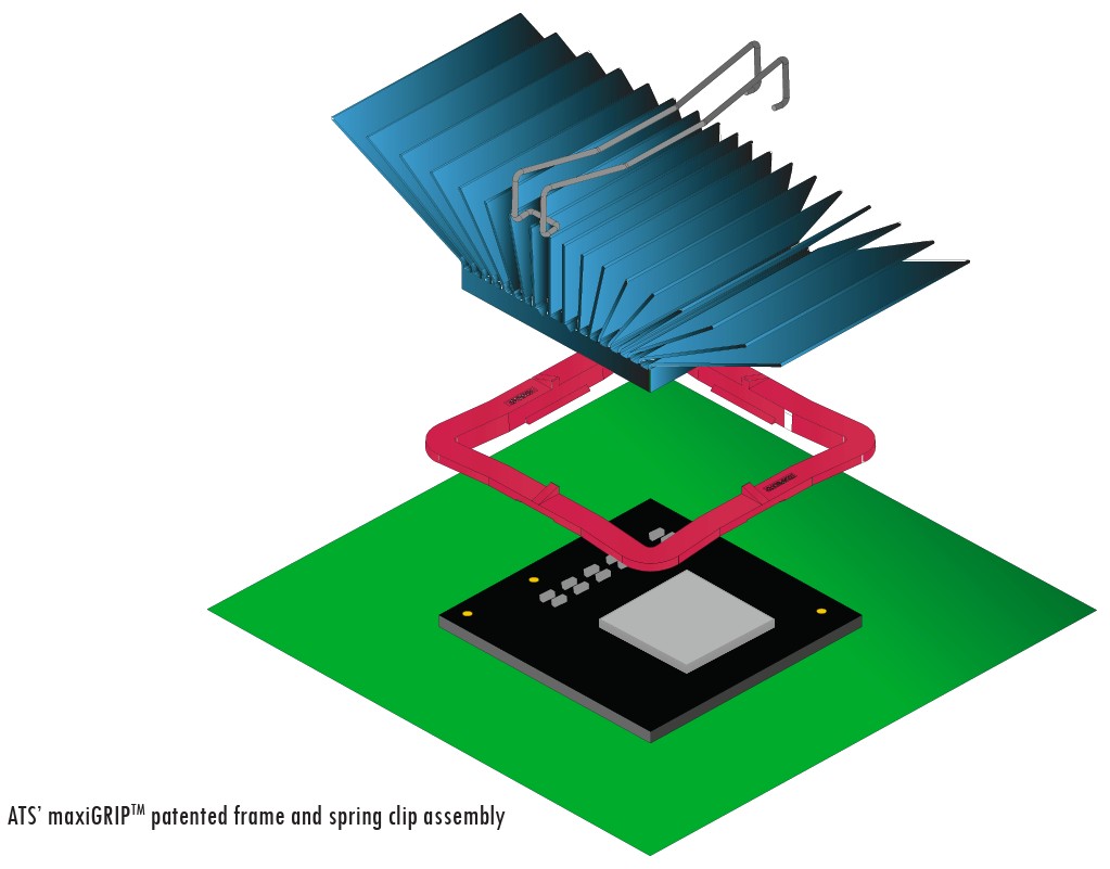 A: The “Double M” spring configuration provides a constant pressure across the component, as illustrated by the spring clip in Figure 2. One of the advantages here is that frame clips are normally rated UL-94V-0 for fire safety and provide thermal stability. Additionally, this mounting method allows for phase-change TIMs that can increase heat transfer efficiency compared to standard adhesive tapes.