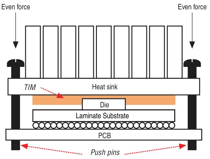 A: Push-type pins are a mechanical attachment used for lidless packages to transfer thermal loads to the PCB. Unlike single-point screw mounts, push pins apply force to multiple sides of the heat sink, as shown in Figure 3. This helps maintain a uniform bond line thickness and reduces the risk of die-edge chipping during the assembly process. Therefore, maintaining even pressure constitutes the primary goal of this mounting style.