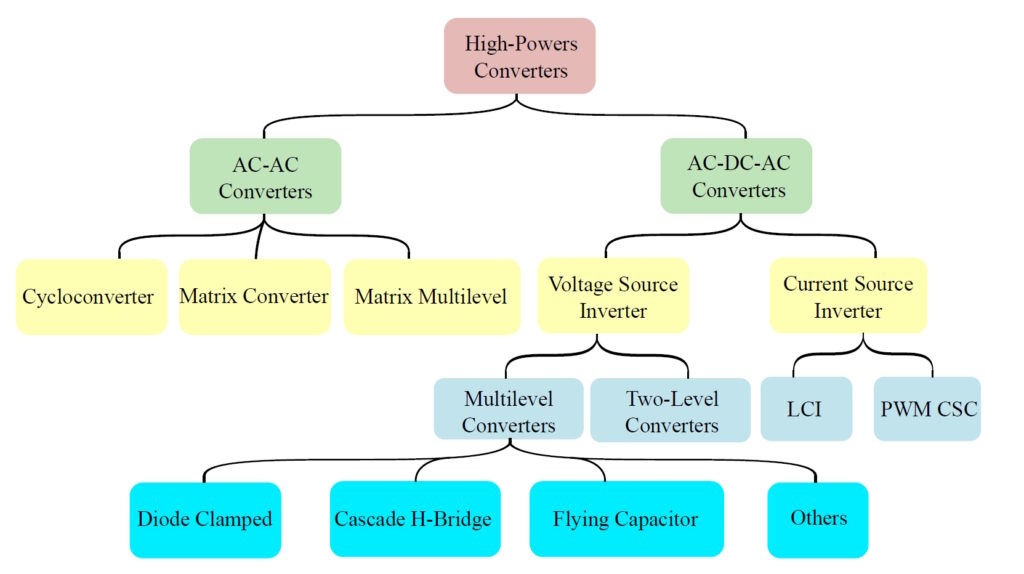 When higher power levels are needed, cycloconverters or matrix multilevel converters can be used. All three are single-stage AC-to-AC converters. Both types of matrix converters use bidirectional switches, while cycloconverters use two sets of unidirectional switches, like thyristors, one for the positive half-cycles and another for the negative half-cycles.