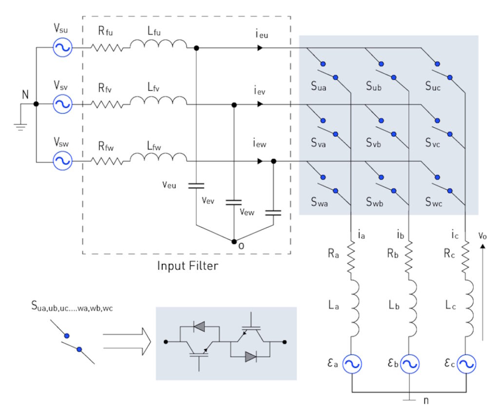 By controlling the conduction periods of the bidirectional switches, a matrix converter can deliver various output voltages, frequencies, and phases. Properly designed, they can deliver higher power densities and improved reliability compared with DC-link topologies. Their primary disadvantage is that they require more power switches and complex control schemes.